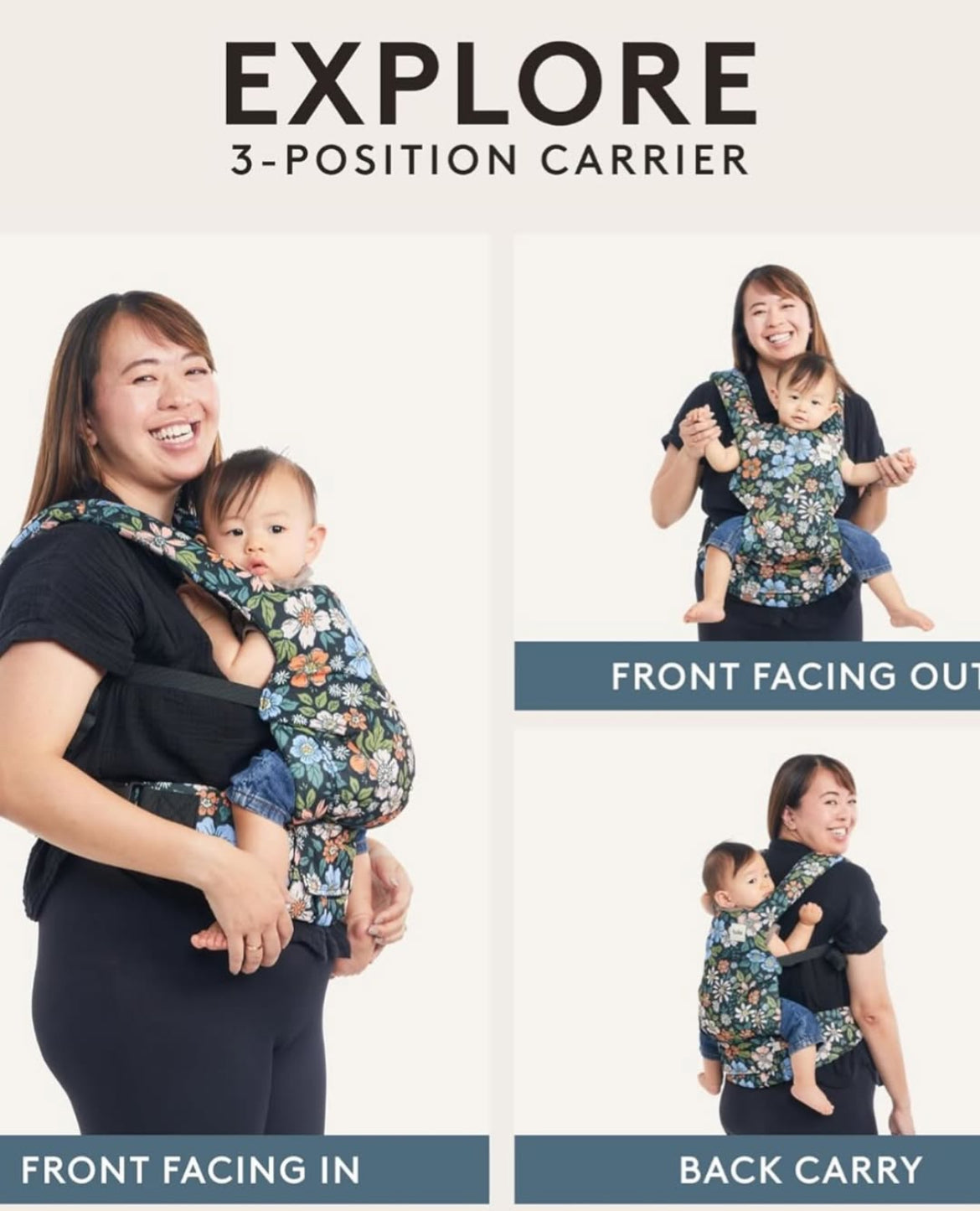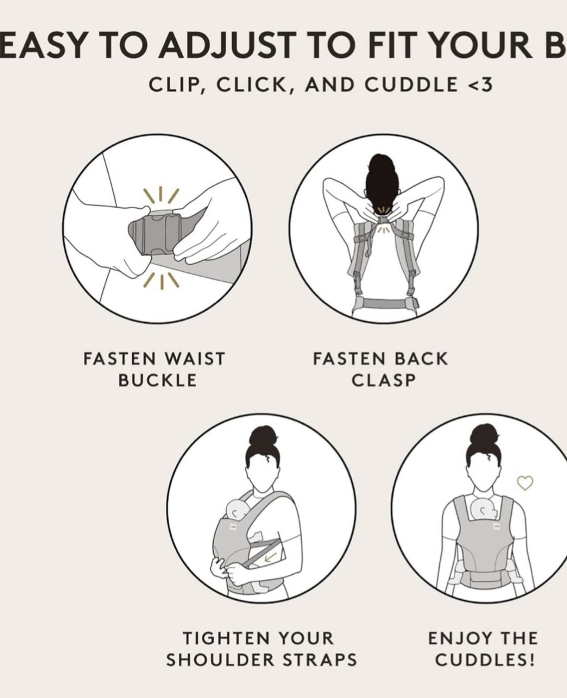 - Múltiples opciones de transporte: frontal hacia adentro, frontal hacia afuera y en la espalda, para adaptarse al crecimiento de tu bebé.