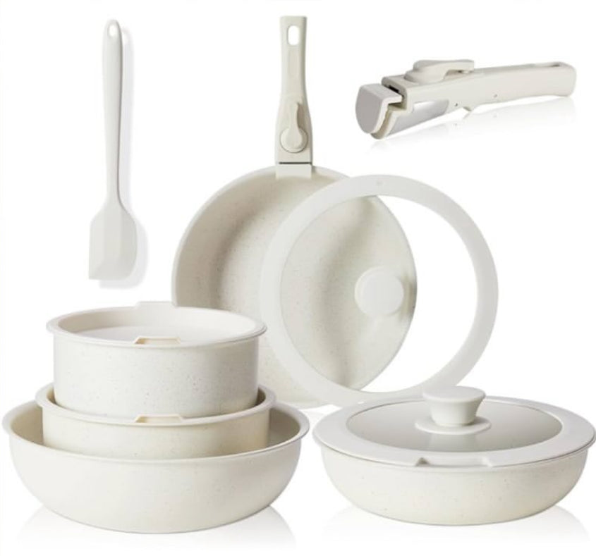 ✨Almacenamiento óptimo y fácil apilamiento con las asas apagadas ahorra hasta un 70% más de espacio del juego de ollas y sartenes desmontables Carote.